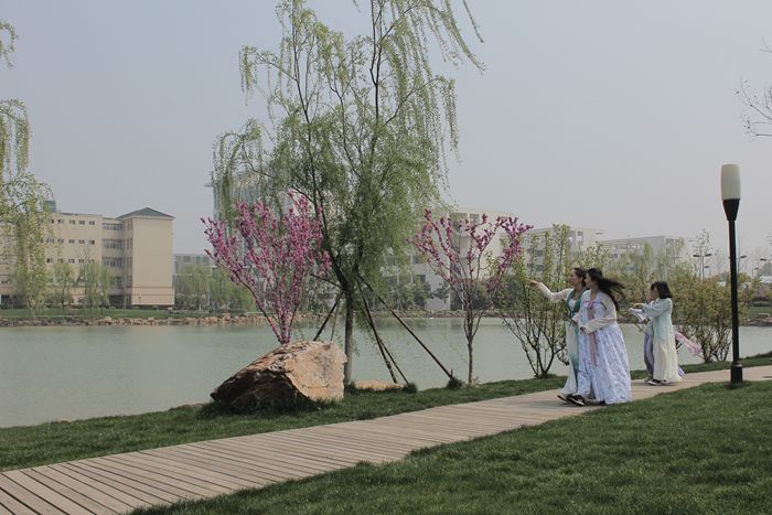 酒不醉人,人自醉。景不黏人,人黏景。曲径通幽的木板小道,三三两两的吸引了校园的学子前来踏春,而汉宣社的姑娘们却别出心裁,一袭素雅汉服,不必有丝竹管弦相伴,也能在这校园春光中忘我蹁跹起舞,春风掠过他们曼妙的身姿,让这份美妙融化在校园的春景之中。