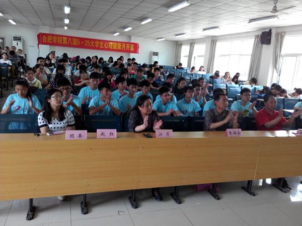 2015年5月14日中午12:30,合肥学院第八届“5·25”大学生心理健康月系列活动启动仪式在校一区善思楼C座顺利开幕。合肥学院大学生成长与发展指导中心主任张福全教授、教育系领导江芳教授、陈昌跃书记、院团委笪春年老师和校心队、心协以及教育系200余名师生出席了本次盛会,启动仪式由校心理健康辅导志愿者专项服务队队员方伶俐同学主持。校心理健康辅导志愿者专项服务队队长朱蓉菲向与会人员介绍了本届大学生心理健康月系列活动的主要内容,活动共分为“心之序”、“心起航”、“心之声”、“心之旅”和“心升华”五大板块,包括心理漫画大赛、心理捕手摄影大赛、现场人体彩绘、微笑团、志愿者走进地方中小学等丰富多彩的活动。随后,分项目学生代表彭丹、袁浩、彭全相继上台发言,分享在“5·25”活动中的经历与感悟,号召全体学生重视心理健康,拥抱青春,珍爱自我。随后,合肥学院大学生成长与发展指导中心主任张福全教授用“重视”、“希望”、“感谢”、“安全”四个词作了总结发言。他希望通过此次活动,参与人员可以锻炼自身的能力,更好地融入社会,更好地服务全校师生、服务地方社会。最后,张福全教授宣布合肥学院第八届“5·25”大学生心理健康月系列活动正式开幕。会后观众有序观看了心理健康宣传展板,参与了微笑团和人体彩绘等活动。